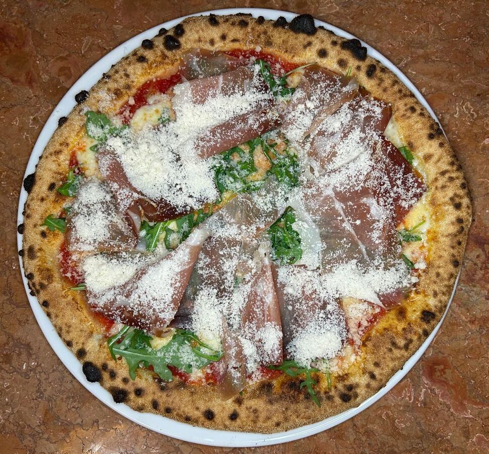sos pomidorowy, parmezan, mozarella, szynka parmeńska, rukola
