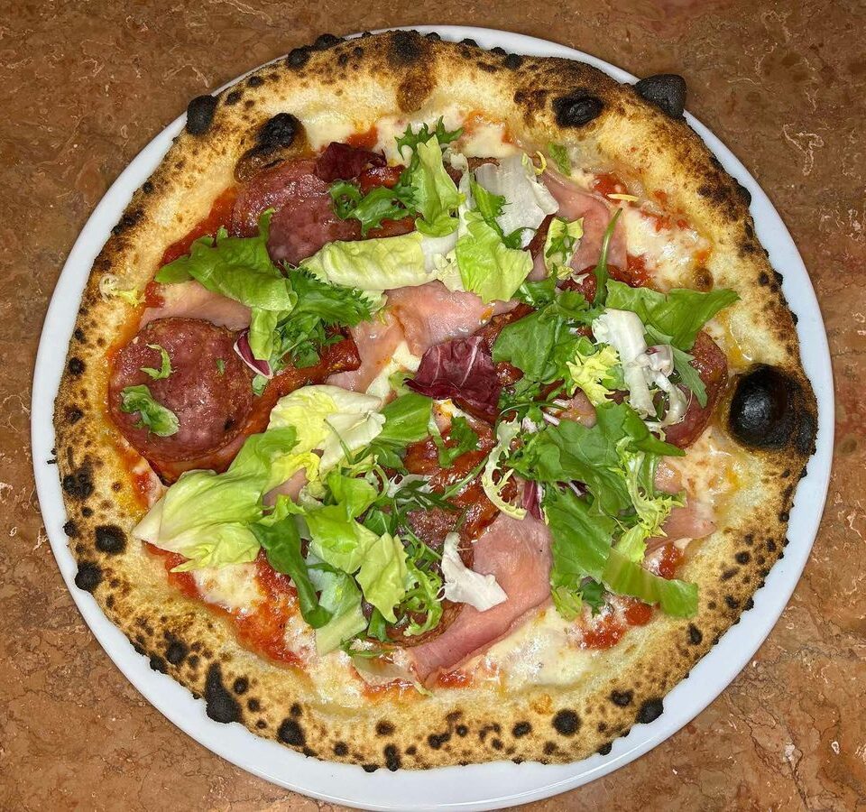 sos pomidorowy, mozarella, salami milano, salami spinato Romano, szynka, sałata mix