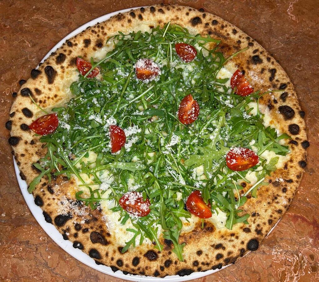 sos śmietankowy, mozarella, rukola, pomidory koktajlowe, parmezan