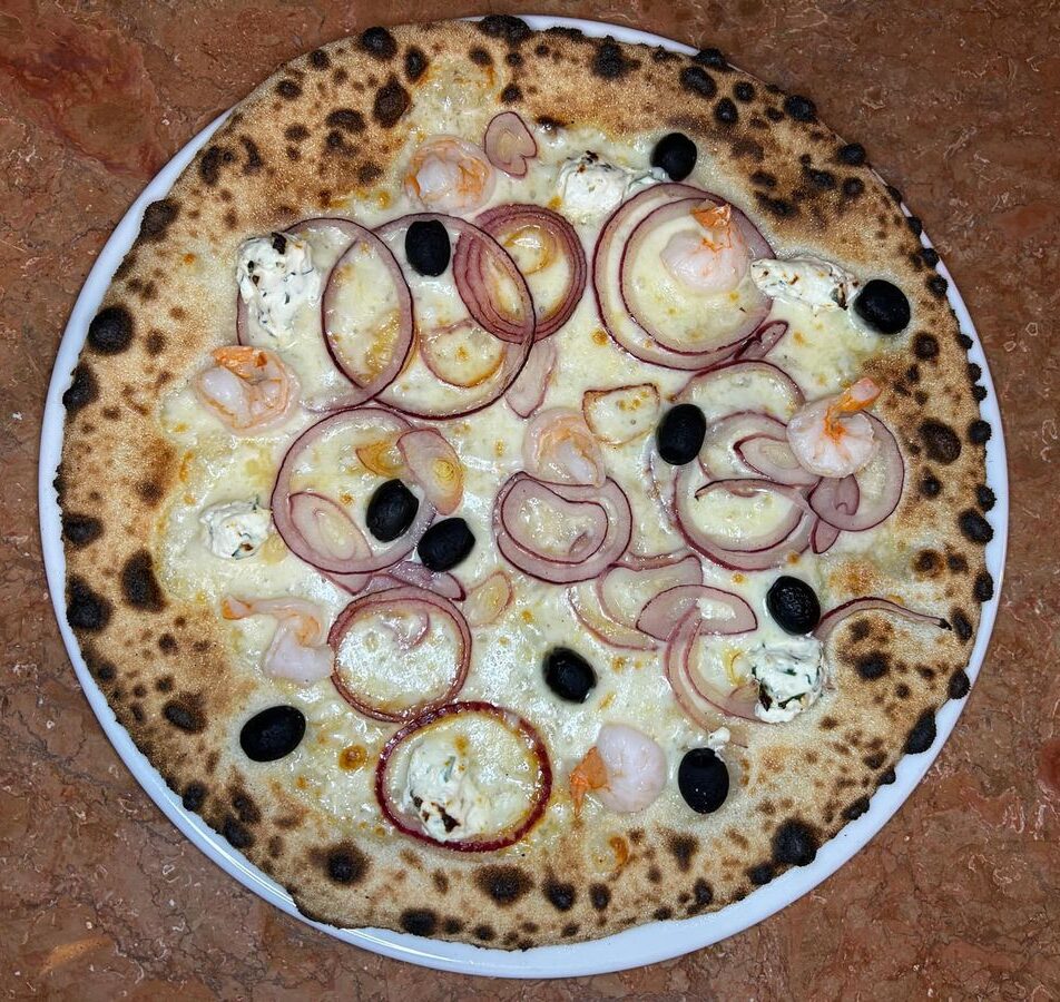 sos śmietankowy, mozarella, ricotta, krewetki, cebula, oregano , oliwki