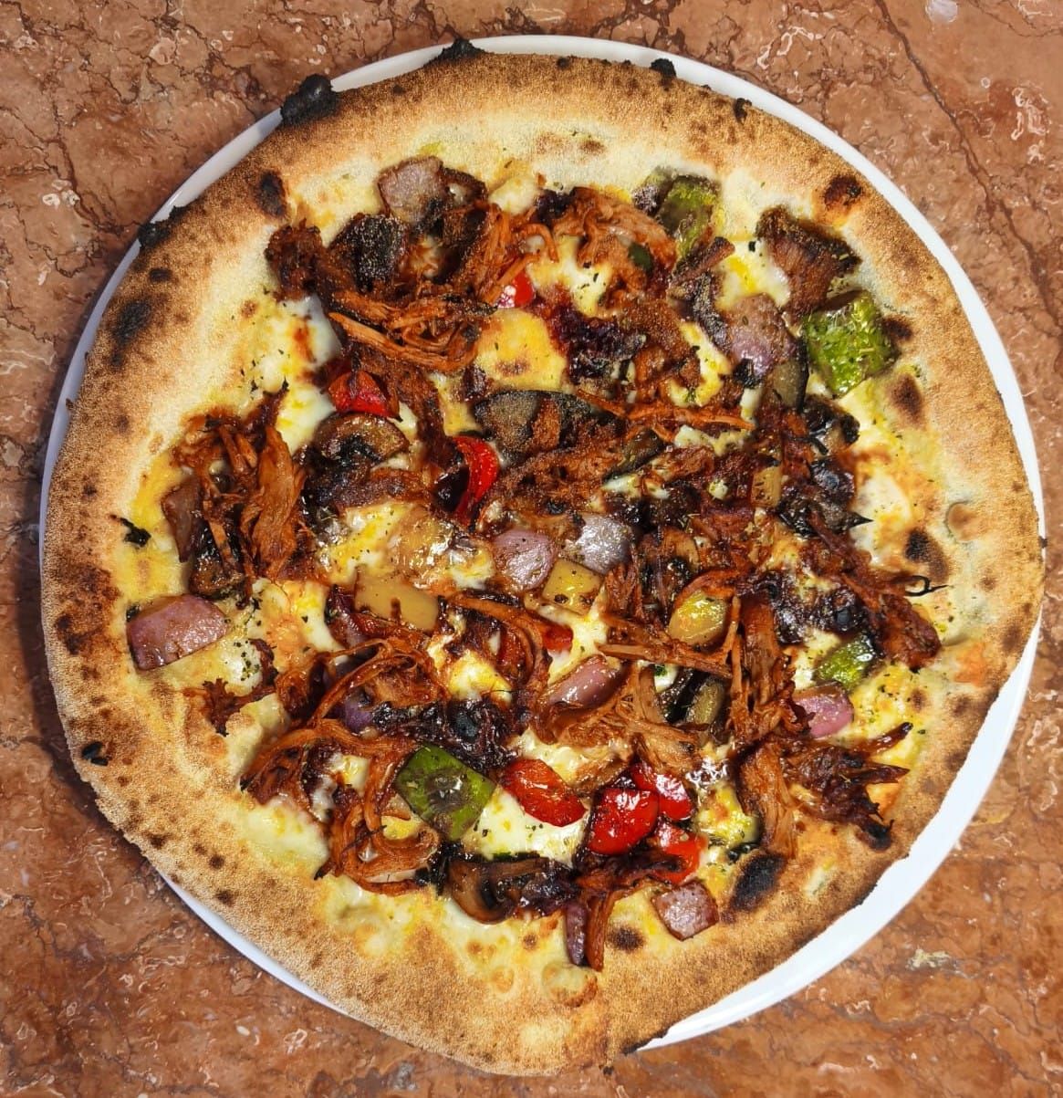 sos barbecue, mozarella, wieprzowina szarpana, grillowane warzywa